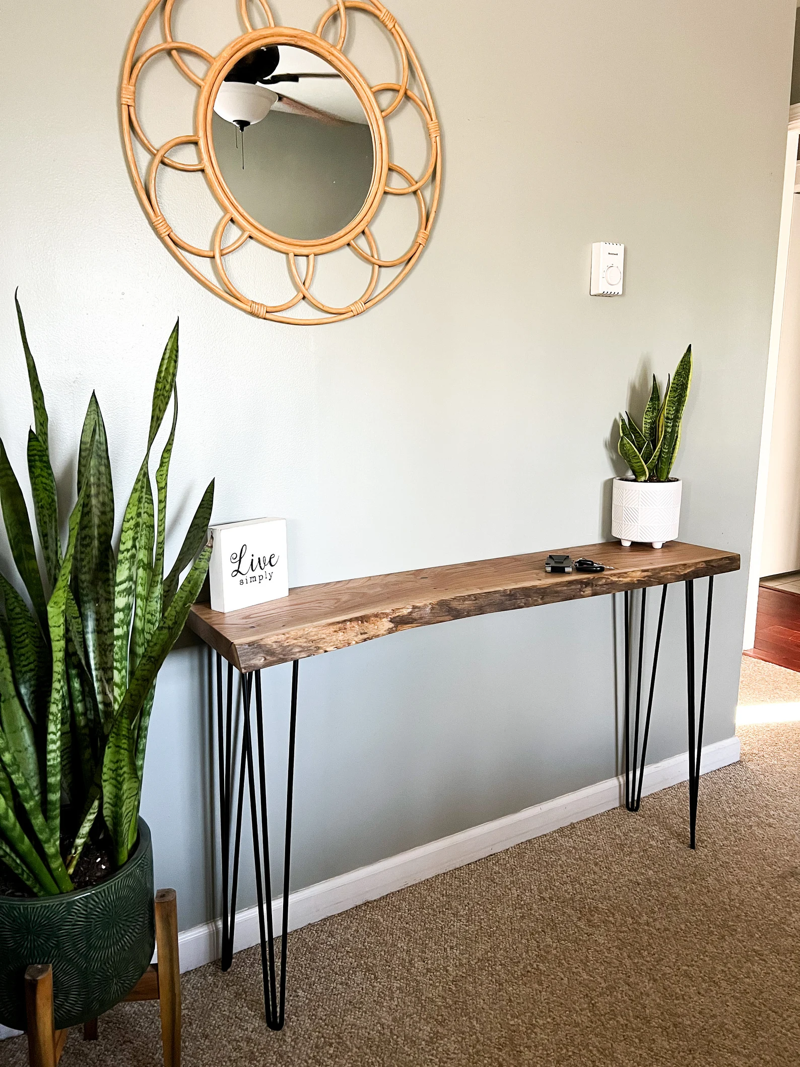 Natūralios medienos ir metalinių kojų derinys suteikia stabilumo, o minimalistinės linijos leidžia šį konsolinį staliuką lengvai derinti su kitais interjero elementais. Toks baldas ne konkuruoja su aplinka, o subtiliai papildo bendrą erdvės estetiką.