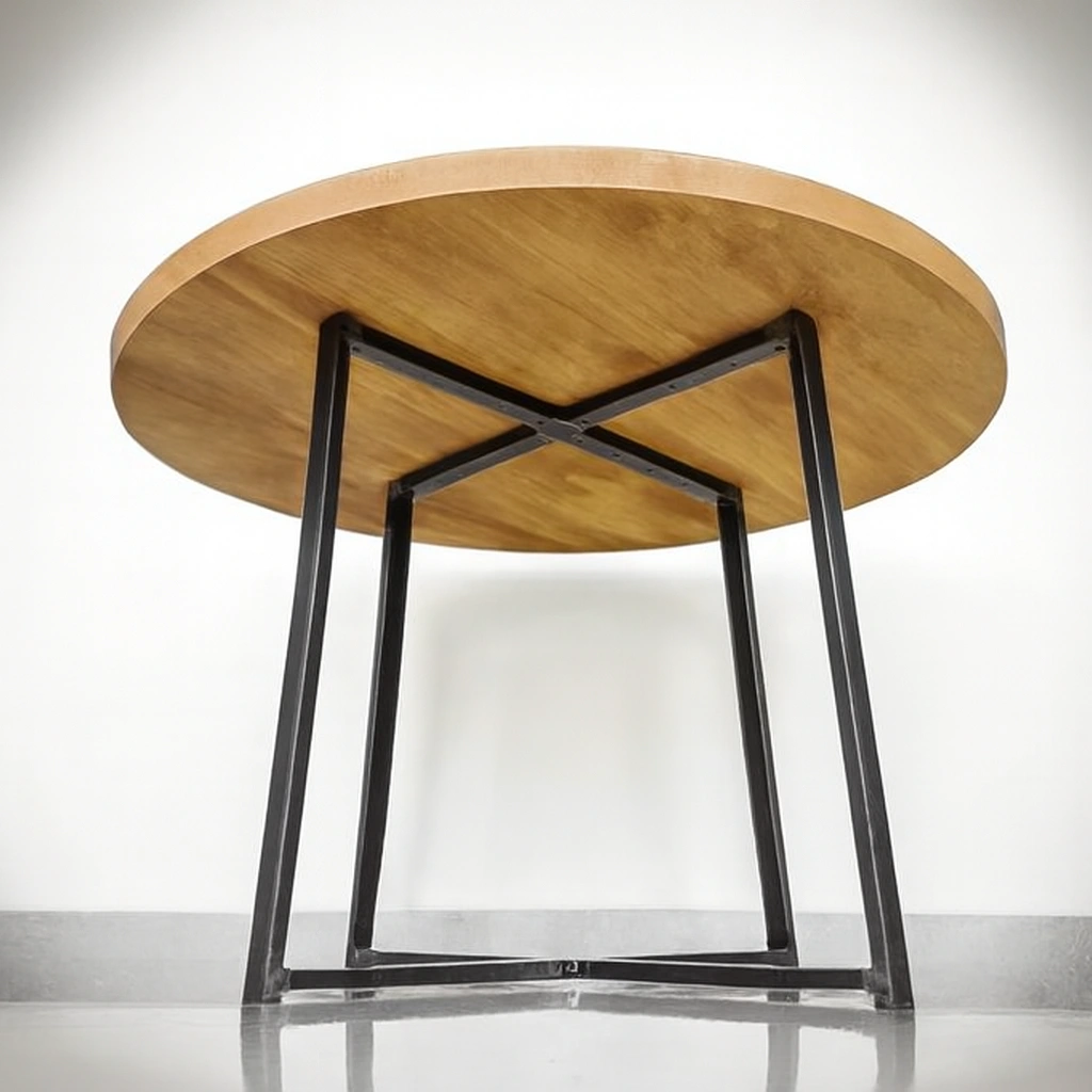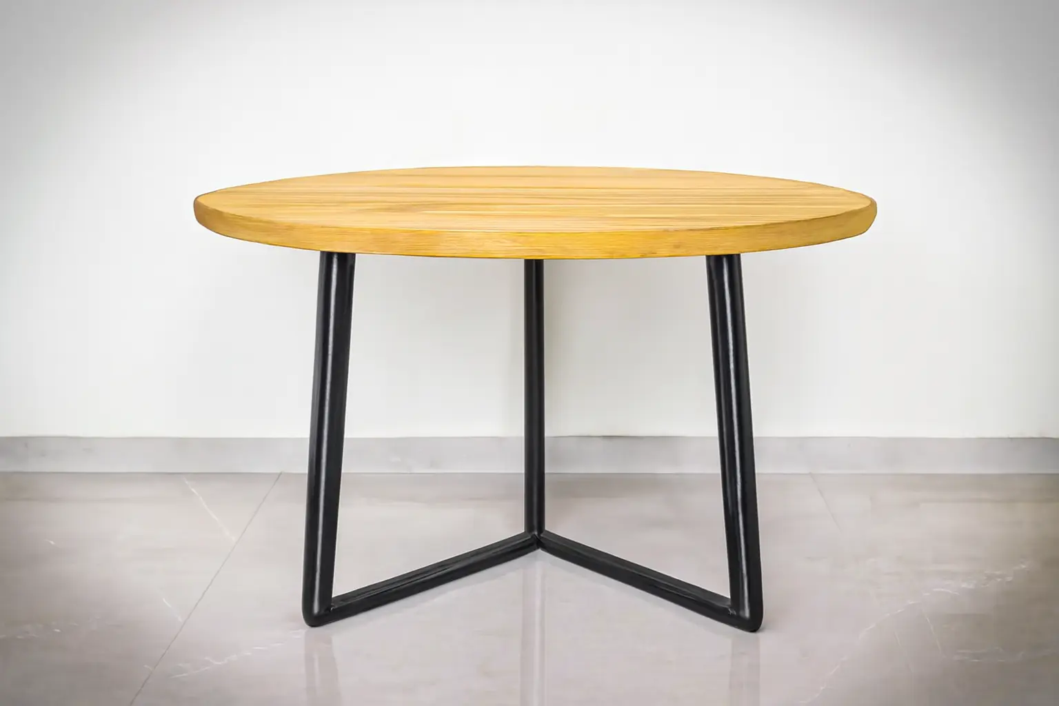 Juodos metalinės kojos suteikia modernų akcentą ir stabilumą. Galima rinktis stalviršio matmenis, spalvą ir formą, todėl stalas lengvai pritaikomas tiek mažose virtuvėse, tiek erdviuose valgomuosiuose.